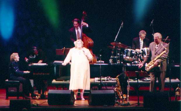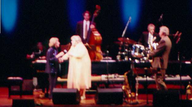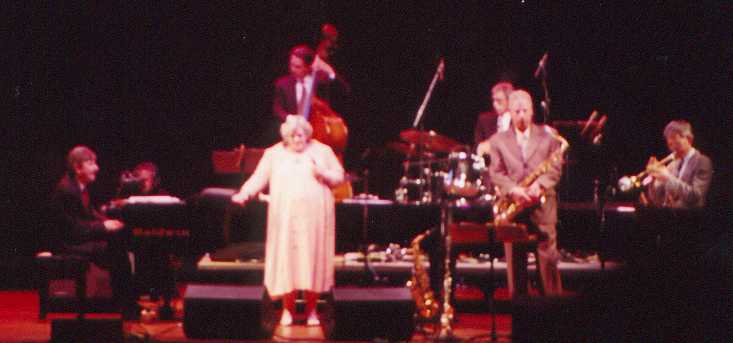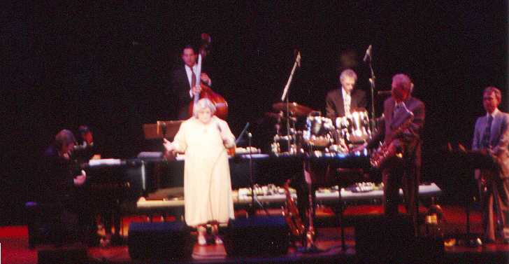 She said she'd opened with a Gershwin tune and wanted to do another one for the audience. She had the good fortune to live by Ira for 35 years. He was an interesting and unassuming man. He told silly little stories and one of the things she is most proud of in her life, is her relationship with him. Some of her favorite words by one of her favorite men...."But Not For Me." With Joe doing a number on those drums, and Art belting it out on the trumpet, Rosie next sang "Strike Up the Band." Then Rosie said she wanted to sing some of Johnny Mercer's song for the audience. These were the songs related to the second world war. She'd met Johnny through her friend Bing Crosby. Bing and Johnny were close friends and had often lifted a beaker together. She recounted the story about the hostess who met Bing and Johnny on the walkway to her home and said to him, "Johnny I don't want your damn flowers in the morning, so behave yourself tonight." The medley included, "P.S. I Love You," "I Thought About You," "Bye Bye Baby" and "I Remember You." Next Rosemary told the audience about one of her "pistol" grandchildren. Harry. Harry has this crazy idea that some day he's going to go on the road, he has lots of enthusiasm and studies hard, but it isn't going to happen! She recounted their experience of being at a restaurant and Harry telling the pianist that his Grandmother wanted to sing for them and he'd play. Only to leave Rosemary half-way through the song. She then sang all of "Hey There" for the audience. Next she said that she really liked Dave Frisberg's songs and wanted to do a couple tonight. She then sang "Sweet Kentucky Ham" with its many regional references the crowd especially enjoyed this piece. She asked Dave if he could write a Brazilian song, so that she could include it on her latest CD. He said, "No!" and instead sent her a book of the songs he's written. He sends her a copy everytime she asks for a song. He later told her that he'd already written a "Brazilian" song. as "Let's Eat Home" has a reference to "RIO" in it. So Rosemary sang that for the audience. On a more serious note Rosemary recalled that when she'd been in New York two or three weeks ago, Tony Bennett came to see her. They talked and decided that those of them who have been around for a while and knew Frank Sinatra, should include one of his songs in everyone of their performances., as he was the inspiration for everyone who came after him. And with a sadness in her voice, she said, "this is his," and then sang "In the Wee Small Hours of the Morning." It was obvious to any listener that she misses him. The audience was most appreciaitve of her sentiment and her rendition of Frank's song.
