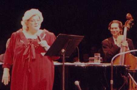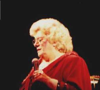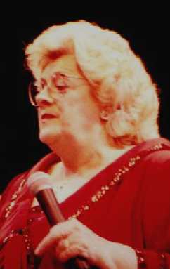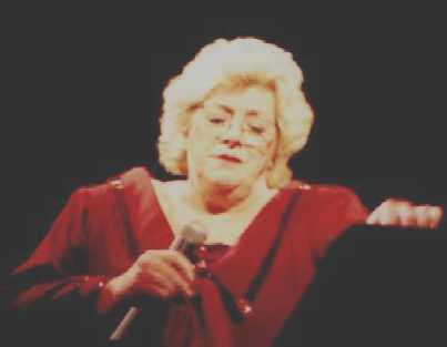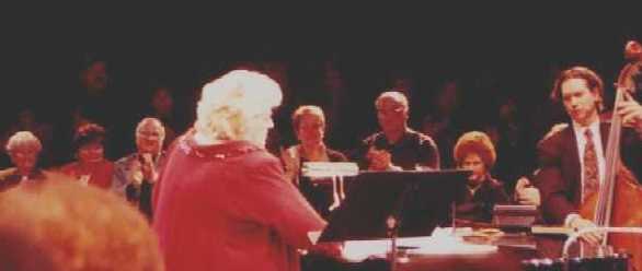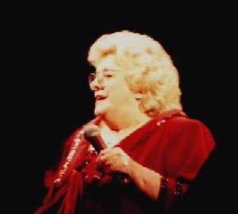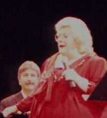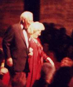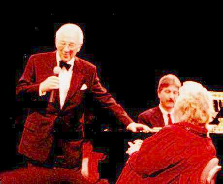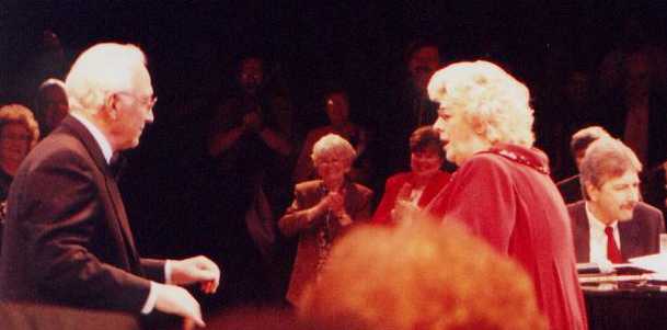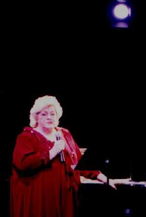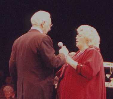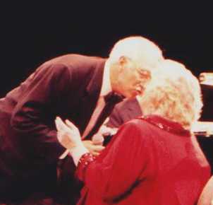 That's Rosemary Clooney being escorted to the stage by her darling husband Dante DiPaolo. She gave a few fans something extra to smile about when she reached out and grabbed their hands as she walked by. She took enough time to flash her beautiful smile and to look them in the eye, lighting up their faces just a bit. That was only one of many special gifts she shared with the audience at Chicago's Drury Lane Theater on Saturday, March 25, 2000. Rosemary was in fine voice and jovial spirits. She was accompanied by some of the best jazz musicians around. She sang, she told jokes, she shared heartfelt memories and she sang some more, leaving a packed house at the Drury, a theater-in-the-round, to feel as if they had visited a bit of "good ole yesterday" and were given a little hope for a few more tomorrows.