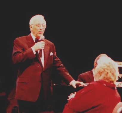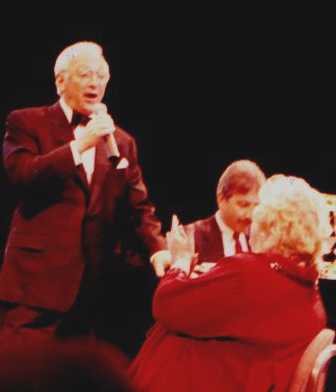 Rosemary shared her story of meeting Pope John Paul II, one of the most wonderful experiences of her entire life, thanks in large part to her dear friend Delores Hope, who had arranged for her to get into St. Peter's Square. After telling the audience some of the details, including how she reversed roles a bit and blessed the Pope and made him laugh, she sang for us Bob Hope's theme song, "Thanks for the Memories," with the real lyrics and not the Pepsodent or Texaco ones. She let us know that next week she would be going to Larry Hagman's house and would be singing at an event to celebrate the music that Hagman's mother, Mary Martin, made famous. Bob and Delores would be there, along with Rosie's daughter-in-law Debby Boone. She told a wonderful story about Bob. Recently his daughter had asked him where he'd like to be someday. Did he want to be near one of the houses, or would he like to be at Arlington National, as they'd really like him there for all that he'd done for the troops? His simple reply was "Surprise me!" Before rousing the audience with her most famous song, Rosemary reminded the audience that she had first sung "Come On-a My House" in Chicago back in 1951, when she was appearing with Frankie Laine, doing seven shows a day ("not anymore folks," she said).