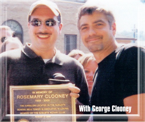 Sunday afternoon there was a dedication ceremony for the Clooneys in the town square. From now on Rosemary's songs will be played at the bell tower in town several times a day. You haven't really lived until you've heard a slow, classical brass bell rendition of "Come On-a My House." A plaque in honor of Rosemary is being placed in the little park there, too. After the ceremony, crowds besieged George, and Dante became a little nervous. I overheard him ask Pam, "Where's Rosemary's plaque?" I told Dante I would find it. He was worried somebody would walk off with it as a souvenir before the town fathers had a chance to permanently mount it in the little park. I found the heavy iron thing and held onto it until a small reception started at the Parkview. Then I turned it over to one of the civic leaders in town. When I had my photo taken with George, I was still lugging that plaque around with me.
