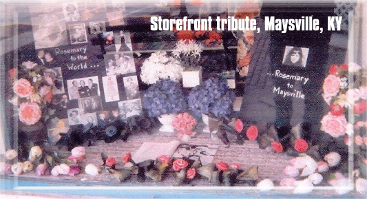 Next day we walked around Maysville, where all of the shop windows contained little tributes to Rosemary and where the Russell theater's marquee read, "Rosemary, Thanks for the Memories." Melinda and I also visited Rosemary's grave site, as yet unmarked. I placed a blue rose on the bare ground there, where she was finally reunited with so many of her departed family members. Here was her beloved Uncle George, for whom her film star nephew was named. There was the marker for her adored younger sister Betty, with whom Rosemary began her career in the mid-1940s. Her mother and father. Her grandparents.